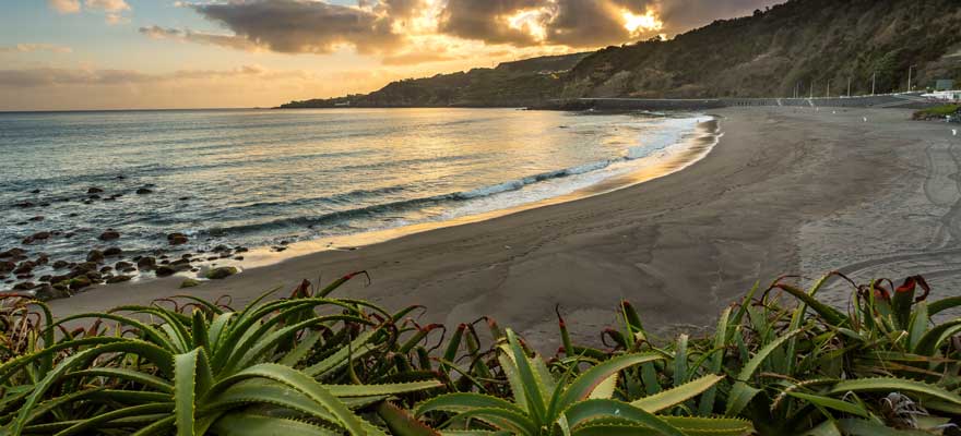 Nach dem Leuchtturm von Ponta da Ferraria rücken bald die Ilhéus dos Mosteiros ins Blickfeld, eine kleine Gruppe charakteristisch geformter Felsobelisken, die direkt vor der Küste aus dem Meer ragen. Im Örtchen Mosteiros gibt es einen der wenigen Sandstrände der Insel. Wenn der Atlantik wohlgesonnen ist, heißt er hier Surfer, Badegäste und Sonnenanbeter willkommen, doch auch sonst lohnt ein Besuch – erzeugen doch die Kulisse der Felseninseln, das türkisblaue Wasser, die weißen Wellenkronen und der tiefschwarze Vulkansand eine ganz besondere Atmosphäre. Nachdem wir selbst dort nach einer halben Stunde Rumlümmeln von einer der größeren Wellen auf dem obersten Strandteil erwischt wurden, raten wir hier auf jeden Fall zu Aufmerksamkeit, Humor oder einem Satz Wechselkleidung.