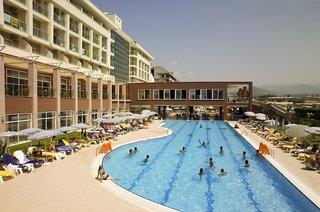 Ausstattung: Garten, Pool, Kinderpool, Wasserrutsche. Liegen, Schirme, Auflagen am Pool und am Strand (geg. Geb.). Empfangshalle, Rezeption, Safe (geg. Geb.). 4 Restaurants (Buffet & à la carte) mit nationalen und mediterranen Speisen, Terrasse, Minimarkt, Shop, Friseur, Diskothek. 176 Zimmer, 7 Etagen, 2 Lifte.
